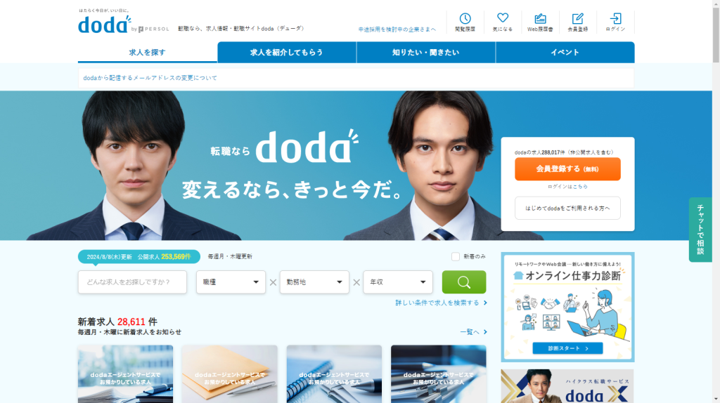 dodaは、日本国内での転職を考えるすべての人に対して、豊富な求人数と充実したサポートを提供している転職エージェントおよび転職サイトです。エージェントの利用と自主的な求人検索の両方を選択できる柔軟なサービス形態に加え、転職活動に役立つさまざまな機能やツールが揃っています。これから転職を検討している方は、ぜひdodaの利用を検討してみてはいかがでしょうか。