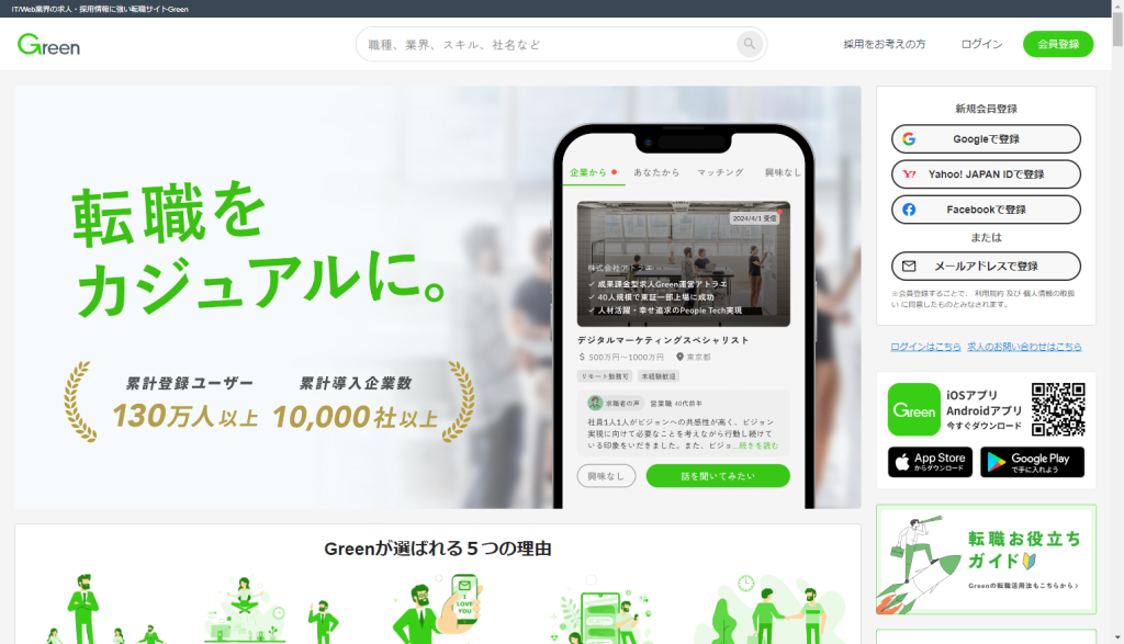 Greenは、若手・中堅のビジネスパーソンを中心に人気のある転職サイトです。IT・Web業界の求人に強みを持ち、企業と求職者のマッチングをサポートしています。以下に、Greenの特徴を詳しく紹介します。